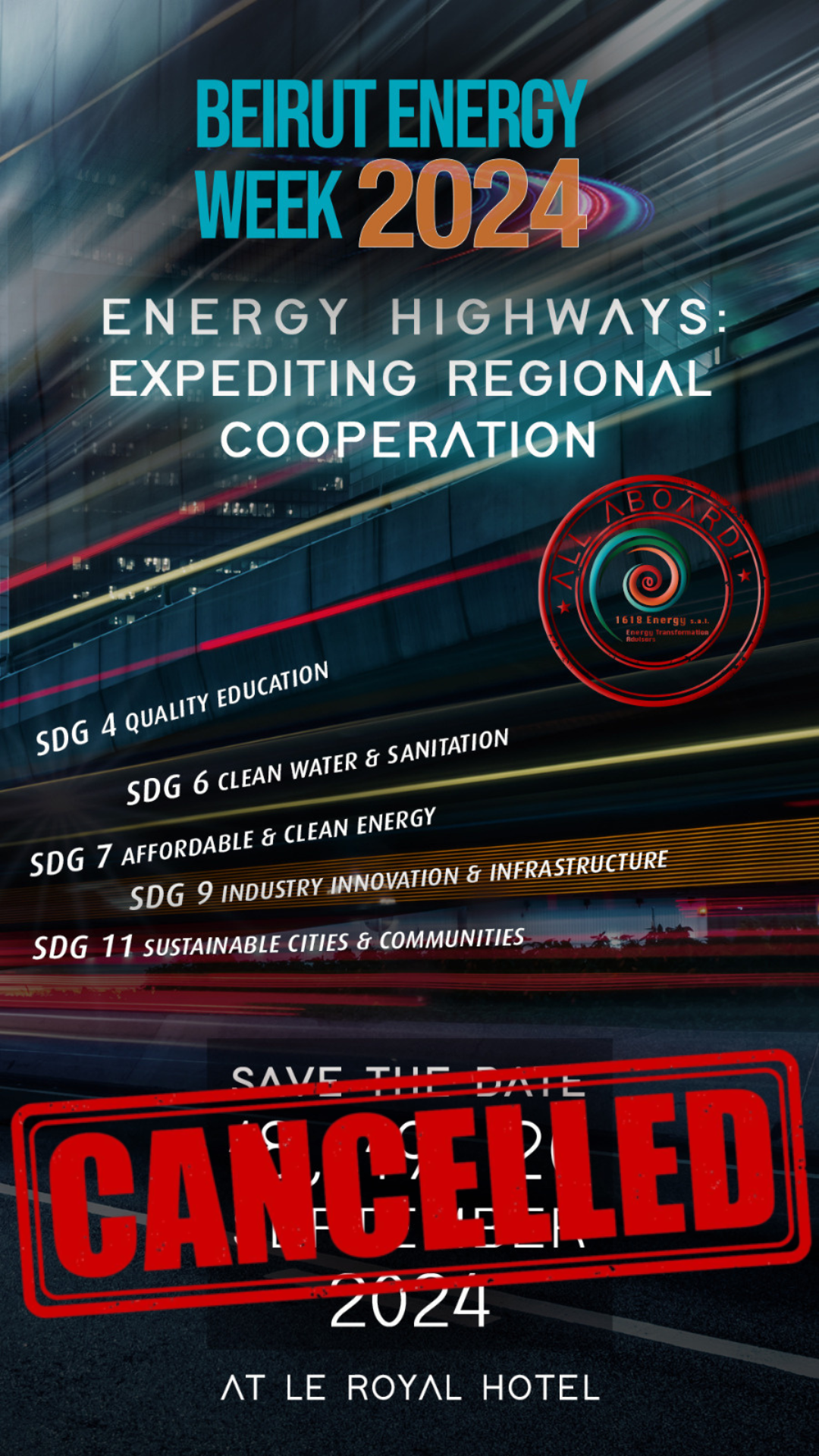 Due to the current situation in Lebanon, the Beirut Energy Week 2024 (BEW24) scheduled for October 23 – 25, 2024 under the theme of “Energy Highways – Expediting Regional Cooperation” is cancelled. Countdown to the next Beirut Energy Week in 2025. See you next year!